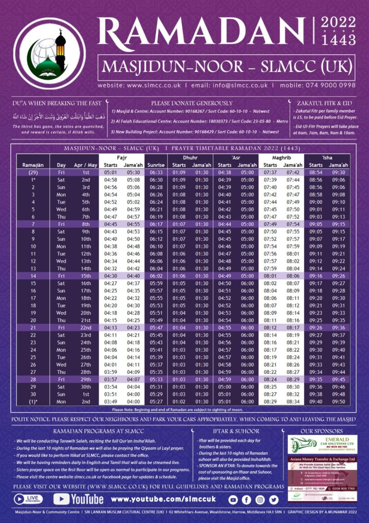 SLMCC EID AL-FITR 1443 ANNOUNCEMENT 🌙 Eid Mubarak! We are happy to confirm that Eid Al-Fitr will be on Monday 2nd May 2022 ⏰ OUR EID PRAYERS SCHEDULE 🔹 6am: Sheikh Abid in English and Arabic 🔹 7am: Sheikh Suhaib in English and Arabic 🔹 8am: Sheikh Thalha in English and Arabic 🔹 9am: Sheikh […]