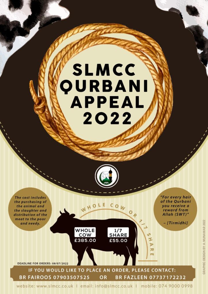 QURBANI WITH SLMCC 2022 | 1443 🐂🐂🐂🐂🐂🐂 As-salāmu ʿalaykum wa-raḥmatullāhi wabarakātuh We invite you to fulfil your duty of Qurbani and to help spread joy to the poor. Commemorate the sacrifice made by Prophet Ibrahim (as), and help those most in need. 💰Cost will be as follows: £55 for one share of cow £385 for […]
